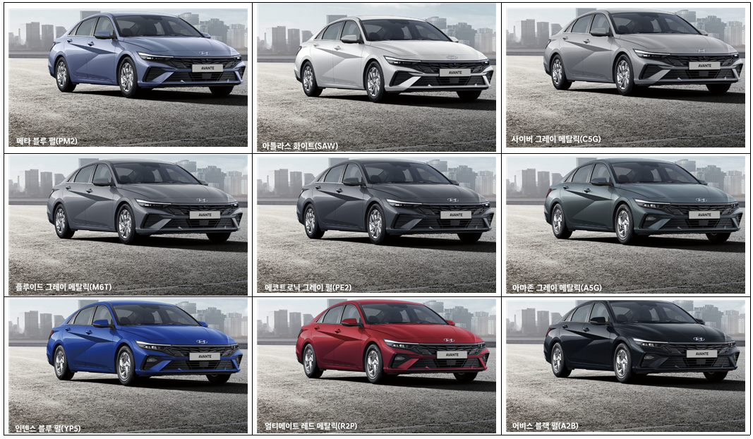 더 뉴 아반떼의 스마트트림의 시작가격은 25,970,000원입니다. 외장색상은 총 9가지이며 내장색상은 1가지로 블랙모노톤만 선택이 가능합니다. 외장색상과 내장색상은 아래 사진을 참고 해주세요.