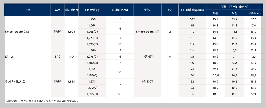 페이스리프트 아반떼 하이브리드(모던트림) 제원 및 성능