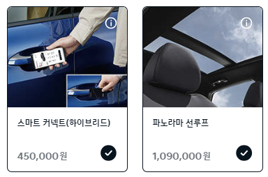 그다음 상세옵션으로는 스타일(하이브리드)[200,000원] 이며, 드라이브 와이즈(시그니처)[450,000원] 입니다. 헤드업디스플레이와 KRELL 프리미엄 사운드는 각각 640,000원과 590,000원입니다. 스마트커넥트(하이브리드)와 파노라마선루프의 경우 각각 450,000원과 1,090,000원입니다.