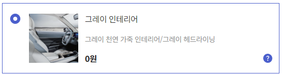 인테리어의 경우 기본인테리어(블랙 천연 가죽 인테리어/블랙 헤드라이닝), 그레이 인테리어(그레이 천연가죽 인테리어/ 그레이 헤드라이닝) 중 선택이 가능합니다. 모두 가격 추가는 없습니다.